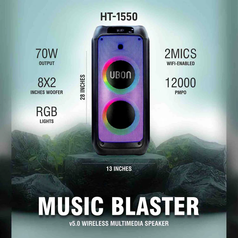 UBON HT-1550 Music Blaster is a 70W party speaker with RGB lights, 12000 PMPO sound, 2×8 inches woofer, and includes two free wireless mics. Perfect for any event or gathering!