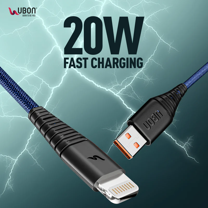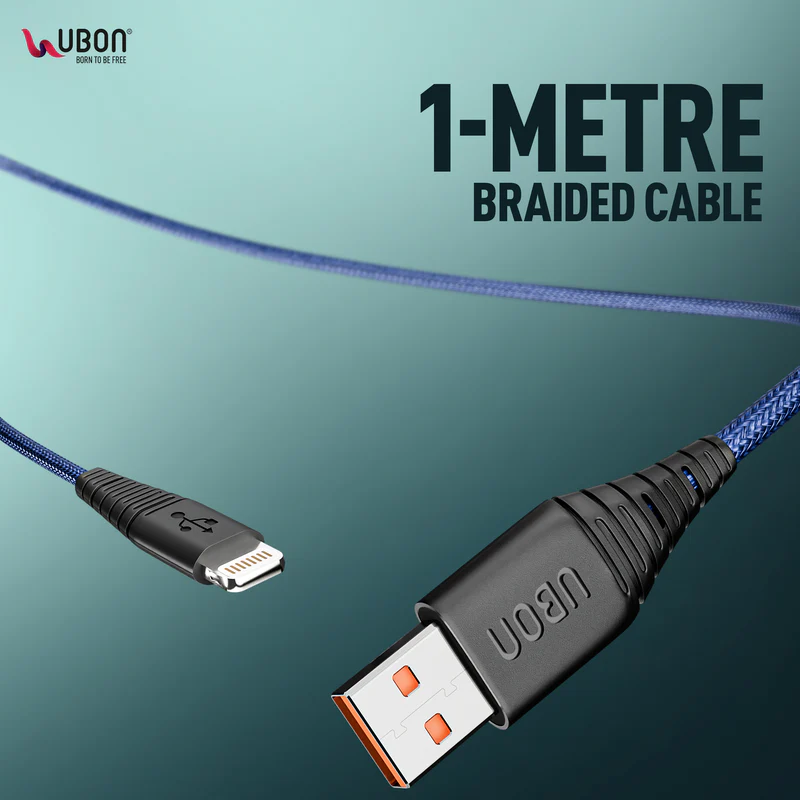 UBON WR-470 Deluxe Cable, made in India, is durable with 50,000 bend tests, braided design, iPhone compatibility, and includes a free tie belt for easy storage.